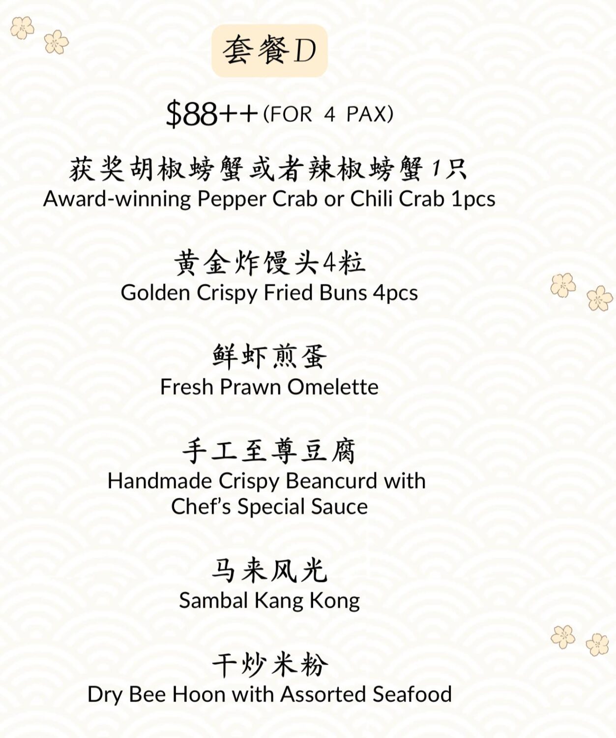 pax:Award-Winning Pepper Crab or Chilli Crab 1 pc,Golden Crispy Fried Buns 4pcs,Fresh Prawn Omelette, Handmade Crispy Beancurd with Chef’s Special Sauce,Sambal Kang Kong,Dry Bee Hoon with Assorted Seafood