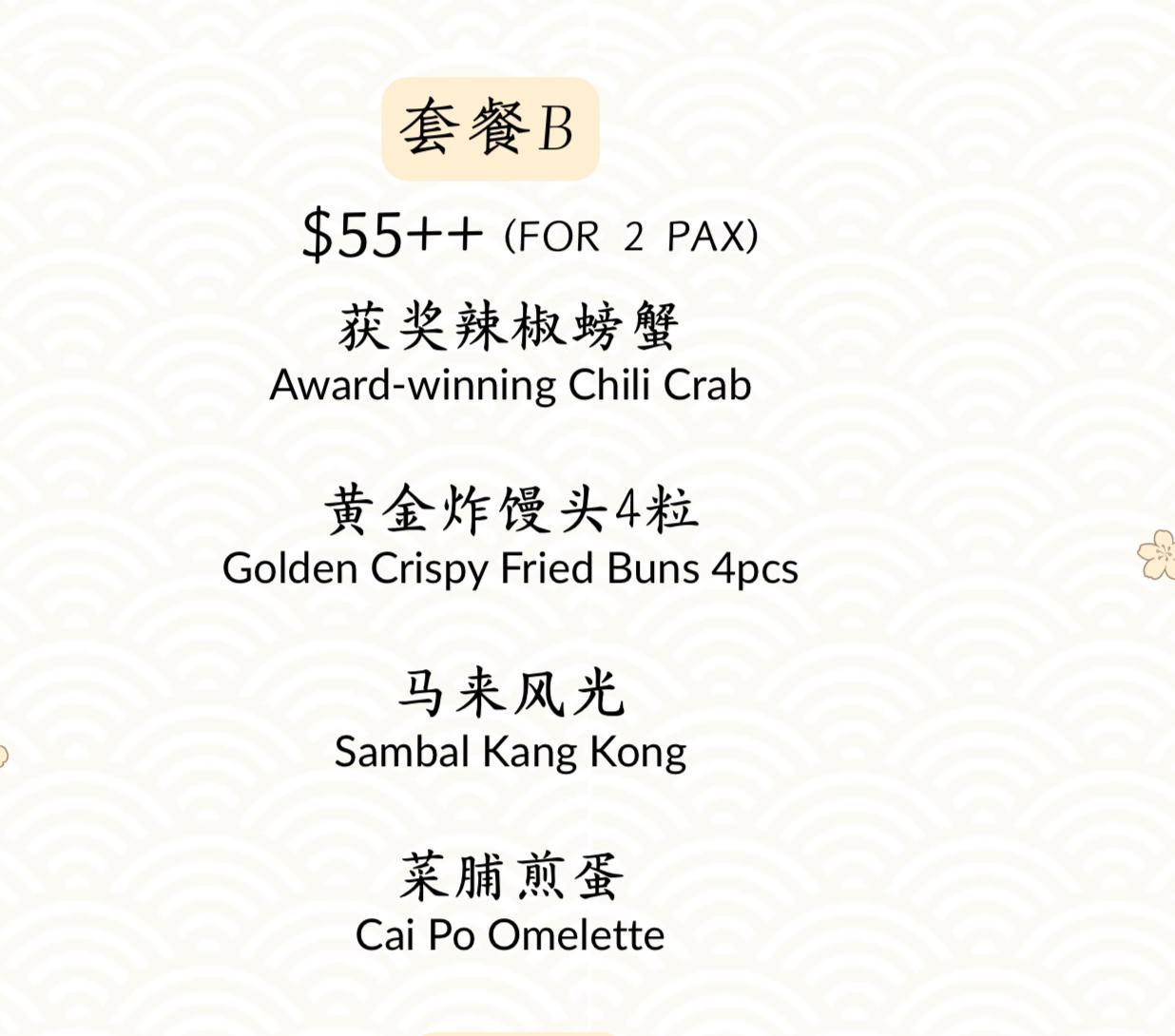 2pax;Award-winning Chilli Crab,Fried Buns 4Pcs,Sambal Kang kong,Cai Po Omelette